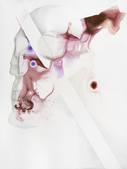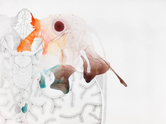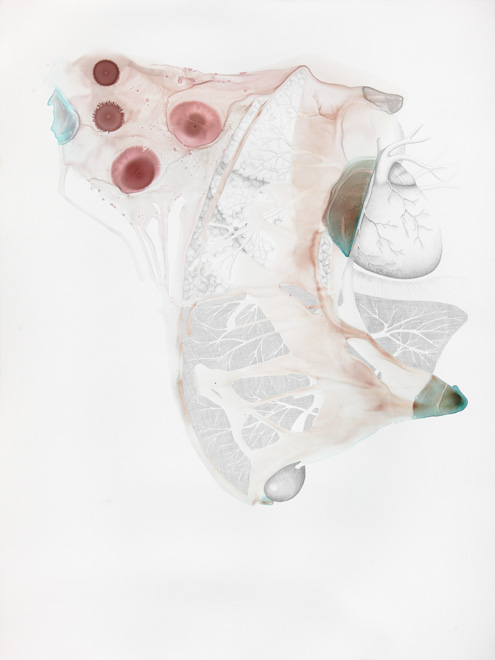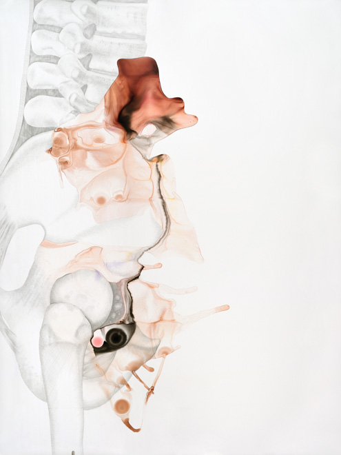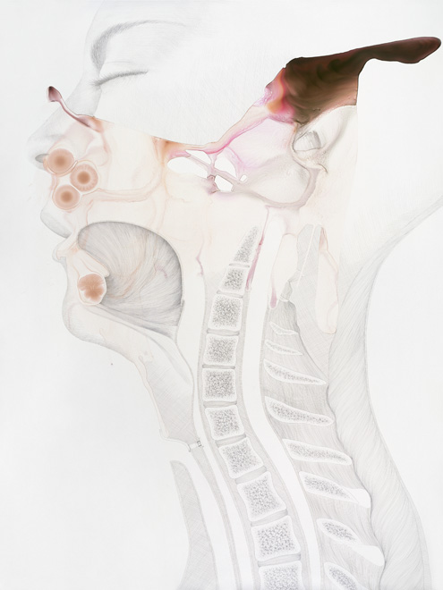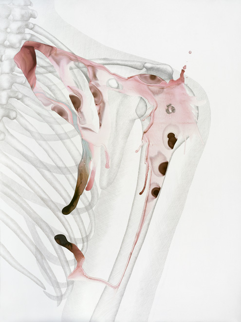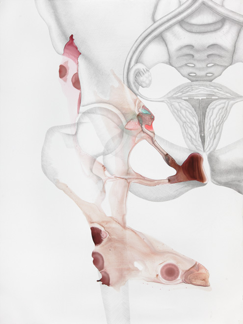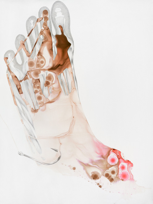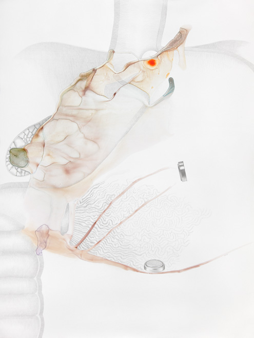 These drawings show the threshold between a familiar and a foreign body, between self and other. Various things enter the body accidentally, deliberately, surgically, aesthetically, violently, pathologically.